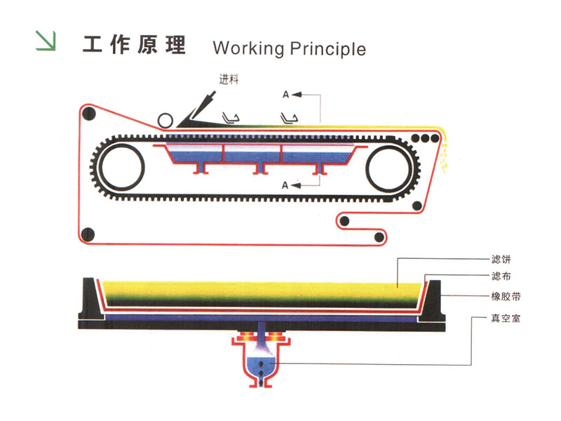 工作原理是通过真空泵形成的负压将水分从污泥中抽走,形成一个过滤带。过滤带由过滤介质橡胶带和给料系统组成,经过给料系统的输送后,物质在橡胶带上形成一层薄膜,过滤带运动驱动物质向前移动,污水通过滤带下落入集水槽,再进行集中处理并排出。