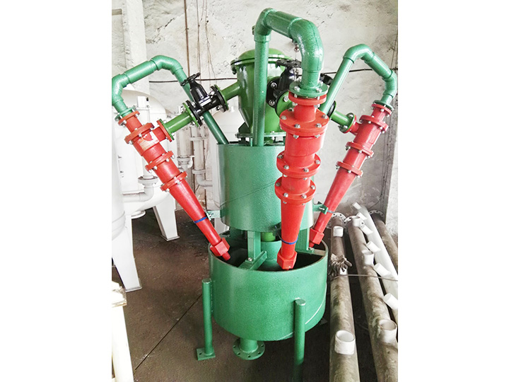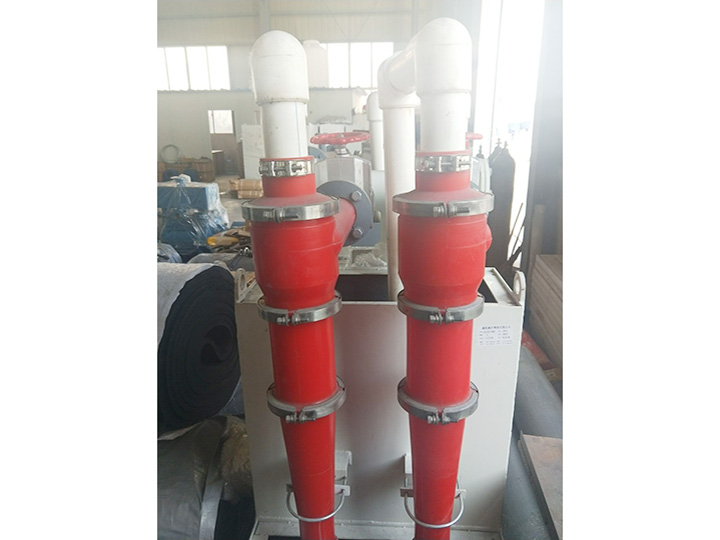 流体旋流器是一种常见的分离分级设备,常用离心沉降原理。基本原理是将具有一定密度差的液-液、液-固、液-气等两相或多相混合物在离心力的作用下进行分离。将混合液以一定的压力切向进入旋流器,在圆柱腔内产生高速旋转流场。混合物中密度大的组分在旋流场的作用下同时沿轴向向下运动,沿径向向外运动,在到达锥体段沿器壁向下运动,并由底流口排出,这样就形成了外旋涡流场;密度小的组分向中心轴线方向运动,并在轴线中心形成一向上运动的内涡旋,然后由溢流口排出,这样就达到了两相分离的目的。作为离心力与重力复合力场的典型设备,因其结构简单、占地面积小、安装操作方便、运行成本低等优点而被用于诸多领域。