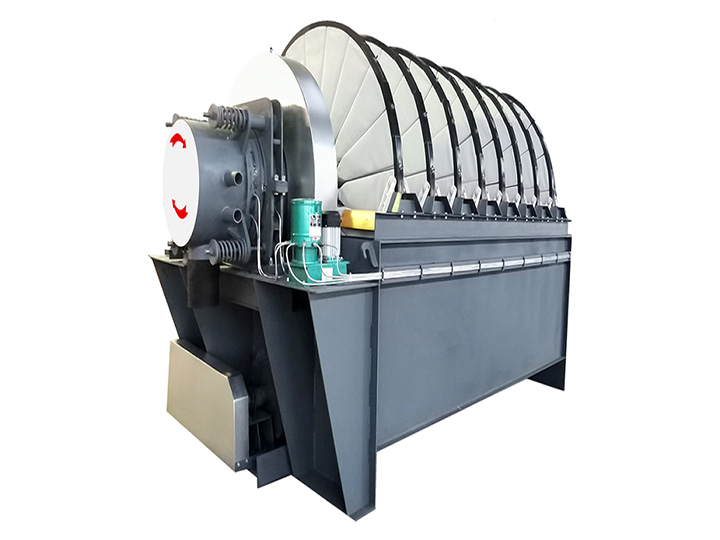 铁精矿处理圆盘过滤机每一个扇形片为 单独的过滤单元,由滤布做成布套在扇形片上形成滤室。过滤盘由电机通过减速器及开式齿轮传动来驱动 ,过滤盘顺时针方向转动,滤室里的矿浆在吸附区借助于真空泵在过滤介质两侧形成的压力差,附着在过 滤盘上形成滤饼后,搅拌器旋转防止固体沉淀,滤饼离开液面后,在真空作用下继续脱去水分。滤液透过 滤布,经过滤液管,从分配头排出。滤饼在卸料区由反吹风卸料落入排料槽,整个作业过程连续循环进行 。