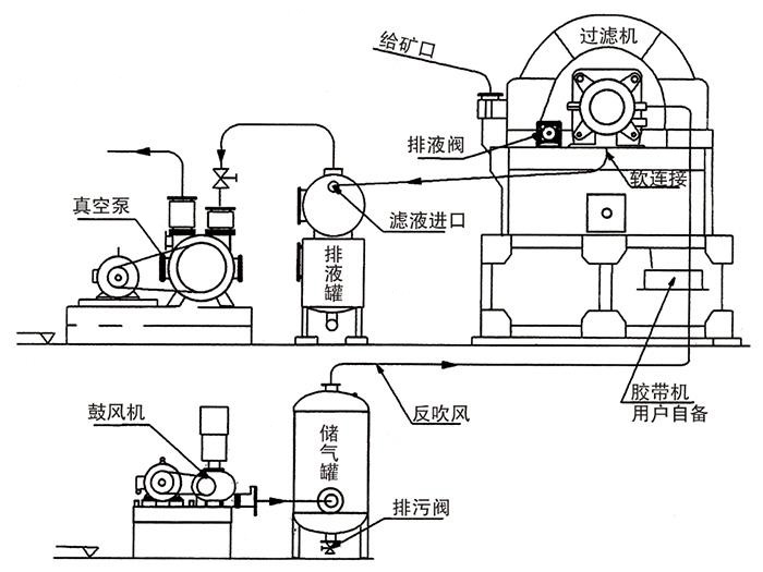 过滤圆盘在矿浆槽中缓慢转动,借助真空泵形成的压力差,使固体颗粒吸附在圆盘的滤布上,形成一定厚度的滤饼。滤液透过滤饼和滤布从中心轴排除,滤饼在刮刀和鼓风机产生的压力风作用下,掉进卸滤饼槽中。
