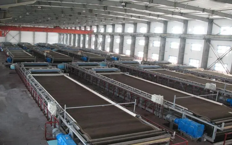 DU1M²-500真空橡胶带式真空过滤机以滤布为介质,采用整体的环形橡胶带作为真空室。环形胶带由传动装置传动连续运行,滤布铺敷在胶带上与之同步运行,胶带与真空滑台接触(真空室与胶带之间有环形摩擦带并通入水形成水密封),料将由布料器均匀的布在滤布上。当真空室接通真空系统时,在胶带上形成真空抽滤区,滤液穿过滤布经胶带上的横沟槽汇总并有中心小孔进入真空室,固体颗料被截留在滤布上形成滤饼。进入真空室的液体经气水分离器(排液罐底部封门出)排出,随着橡胶带的移动,已形成的滤饼依次进入滤饼洗涤区和吸干去,最后滤布与胶带分开,在卸料辊处由出料端将滤饼卸出。卸除滤饼的滤布经清洗后获得再生,在经过一组托布支撑辊和纠偏装置后重新进入过滤区,开始进入新一过滤周期。橡胶带式真空过滤机真正意义上实现了连续运行、连续过滤、物料从下料、真空脱水、滤饼洗涤、脱渣到滤布清洗,可以不间断的同步进行。