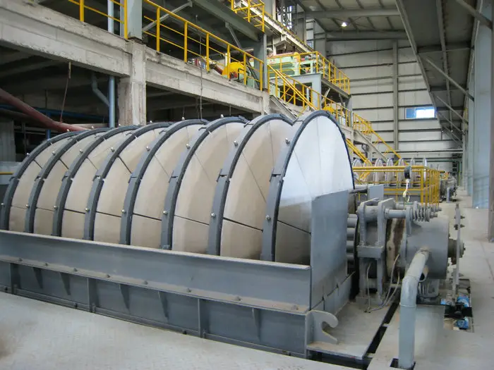 圆盘式真空过滤机的工作原理与传统盘式真空过滤机工作原理相近,利用抽取过滤介质(微孔滤板)内腔真空产生与外部的压差,使料浆槽内悬浮的物料在负压作用下吸附在过滤介质上,固体物料因不能通过过滤介质上的细小微孔被截留在过滤介质表面,而液体因真空压差的作用以及滤板的亲水性顺利通过过滤介质进入气液分配装置(真空桶)外排或利用,达到固液分离的目的。