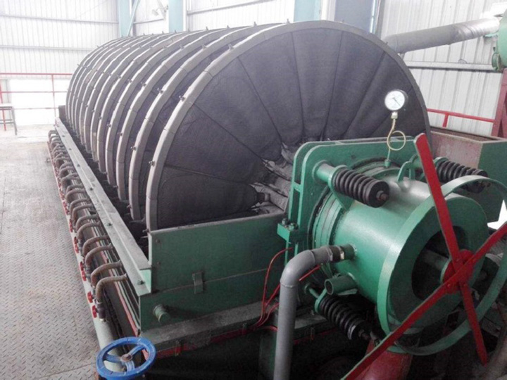 1、开始工作时,浸没在料浆槽的滤扇在真空作用下,在滤板表面形成-层较厚的颗粒堆积层,滤液通过滤扇过滤至分配头到达真空桶。